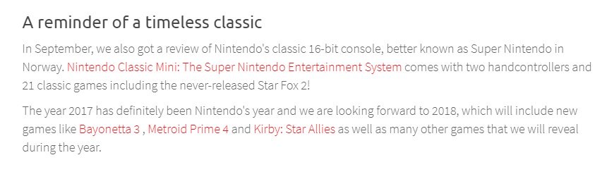 Λάδι στη φωτιά ρίχνει η Nintendo Norway (Νορβηγίας), η οποία σε post στην επίσημη ιστοσελίδα, κάνει αναφορά πως εντός του 2018, θα δούμε τόσο την κυκλοφορία του πολυαναμενόμενου Metroid Prime 4, όσο και του Bayonetta 3! Η είδηση αυτή έρχεται λίγες μέρες μετά την φήμη πως το Bayonetta 3 πολύ πιθανόν να κυκλοφορήσει μέσα στο καλοκαίρι.
