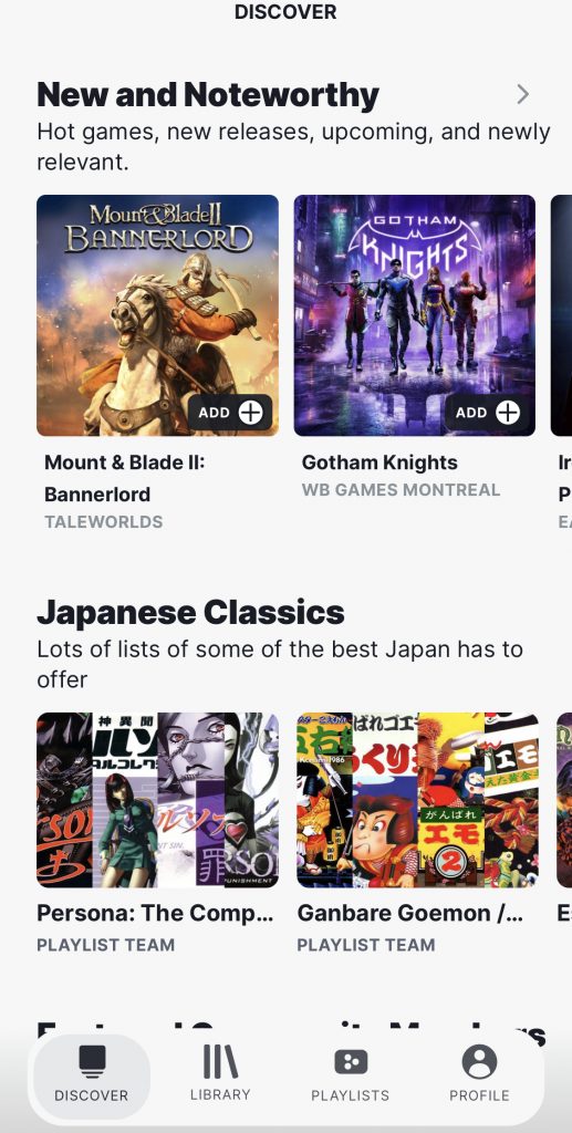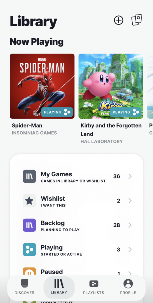 Σε μια παρόμοια λογική κινείται και το Playlist, το οποίο δίνει την δυνατότητα στον χρήστη να ταξινομήσει τα παιχνίδια του σε 6 προεπιλεγμένες κατηγορίες (Wishlist, Backlog, Playing, Paused, Beat, Quit), να δημιουργήσει custom playlists, καθώς και να ανακαλύψει νέα παιχνίδια και curated λίστες.