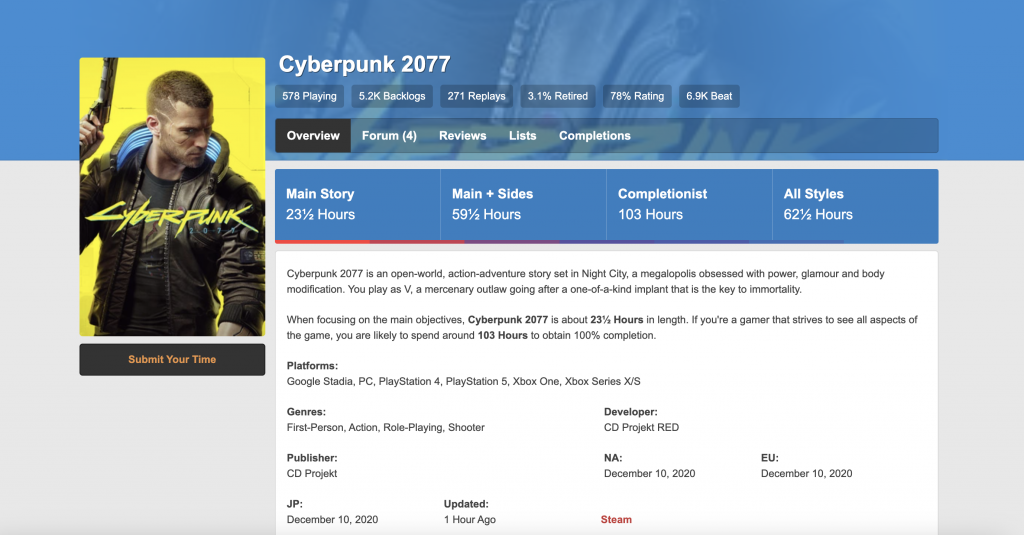 Για πολλούς gamers, ένας παράγοντας για την αγορά ενός τίτλου, είναι το σύνολο ωρών που χρειάζονται για να το τερματίσει. Εδώ έρχεται το HowLongToBeat για να τους λύσει τα χέρια, το οποίο αναγράφει πόσες ώρες χρειάζονται για τα Main Story, Main Story + Extras (π.χ. side quests), και Completionist. Συστήνεται σε όσους δεν έχουν στην διάθεσή τους πολλές ώρες καθημερινά, καθώς και σε οργανωτικά nerds που προγραμματίζουν στο μέγιστο την καθημερινότητά τους.