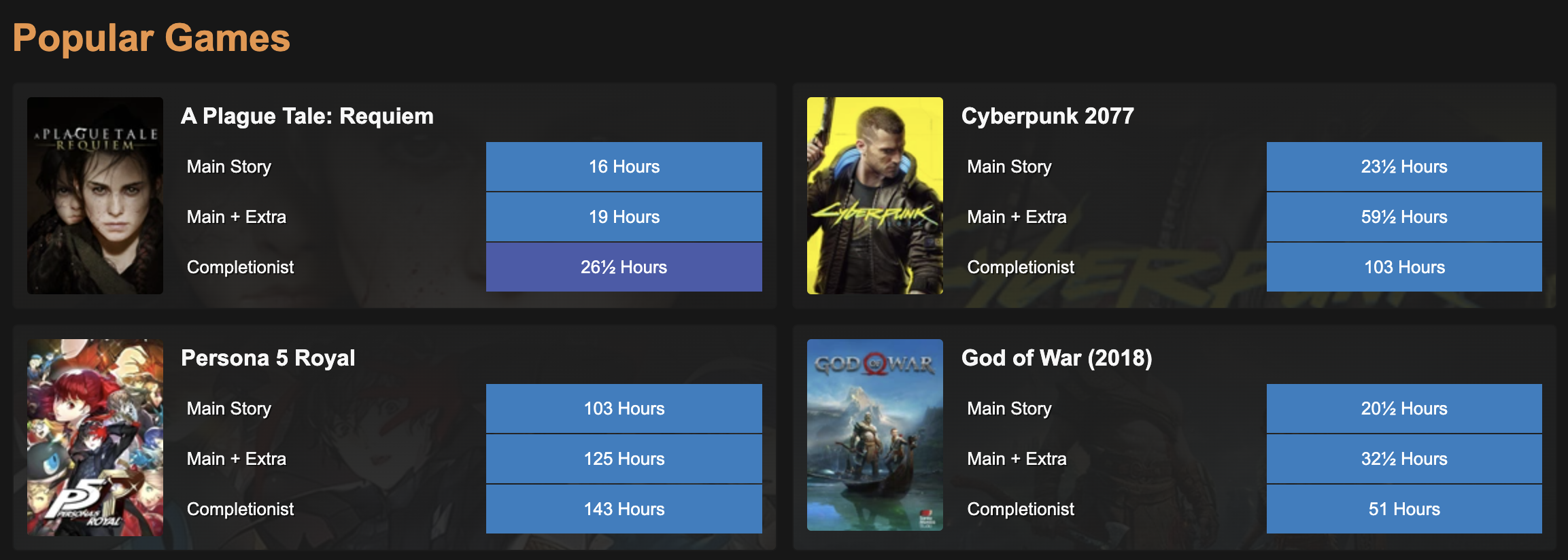 Για πολλούς gamers, ένας παράγοντας για την αγορά ενός τίτλου, είναι το σύνολο ωρών που χρειάζονται για να το τερματίσει. Εδώ έρχεται το HowLongToBeat για να τους λύσει τα χέρια, το οποίο αναγράφει πόσες ώρες χρειάζονται για τα Main Story, Main Story + Extras (π.χ. side quests), και Completionist. Συστήνεται σε όσους δεν έχουν στην διάθεσή τους πολλές ώρες καθημερινά, καθώς και σε οργανωτικά nerds που προγραμματίζουν στο μέγιστο την καθημερινότητά τους.