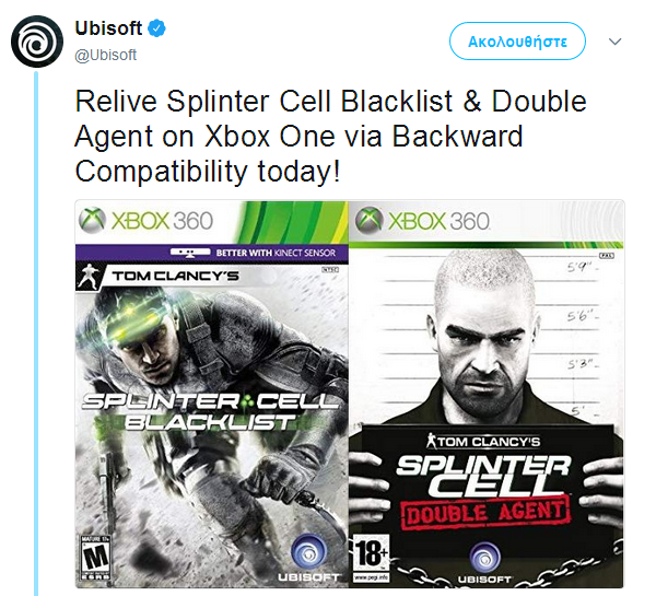 Αυτή τη φορά πρόκειται για τον τελευταίο τίτλο της σειράς Blacklist, αλλά και τον παλαιότερο Double Agent. Όσοι τυχόν έχετε κρατήσει τα αντίτυπά σας από το Xbox 360, το μόνο που έχετε να κάνετε είναι να βάλετε το δισκάκι στην κονσόλα σας και να κατεβάσετε τον τίτλο.