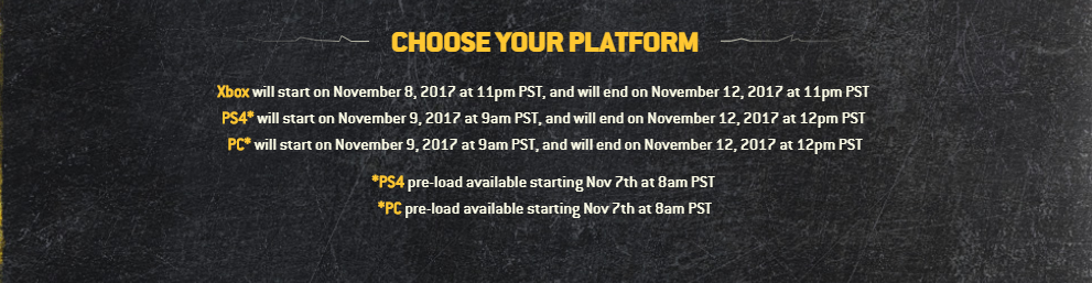 Όπως μπορείτε να δείτε και παραπάνω, η δωρεάν περίοδος ξεκινάει 8 Νοεμβρίου για Xbox One και 9 Νοεμβρίου για PC και PlayStation 4, με το Pre-Load να είναι διαθέσιμο δύο μέρες νωρίτερα μόνο σε PC και PlayStation 4. Η δοκιμαστική περίοδος θα λήξει 12 Νοεμβρίου.