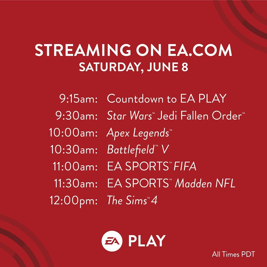 Η ΕΑ φέτος βρίσκεται σε μία ήσυχη κατάσταση καθώς πέρα από την επιτυχία του FIFA 19 οι άλλες δύο μεγάλες κυκλοφορίες το Anthem της Bioware αλλά και το Battlefield 5 δεν τα πηγαίνουν και τόσο καλά στις πωλήσεις. Φυσικά εδώ και λίγα χρόνια ο Καναδικός κολοσσός μας έχει συνηθίσει σε κάποια events πριν την έκθεση Ε3 και εκεί ανακοινώνει ως συνήθως νέους τίτλους ή τίτλους σε ανάπτυξη. Έτσι φέτος το event ΕΑ Play 2019 θα ξεκινήσει στις 8 Ιουνίου και το πρόγραμμα θα το δείτε στην παρακάτω εικόνα. Φυσικά μέχρι στιγμής δεν έχουμε κάποια ευχάριστη έκπληξη αλλά σίγουρα όλοι περιμένουμε ένα gameplay video από το νέο Star Wars Jedi: Fallen Order .