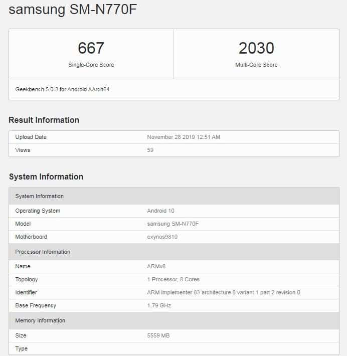 Όσον αφορά στα χαρακτηριστικά του, σύμφωνα με το Geekbench, το Note 10 Lite αναμένεται να έχει το παλιό SoC Exynos 9810 (που “φοράει” το Note9) χρονισμένο στα 1,79GHz και 6GB RAM. Θα τρέχει Android 10 με το skin της Samsung, OneUI 2, και στη φωτογραφία μπορείτε να δείτε πως τα έχει πάει στα σκορ.