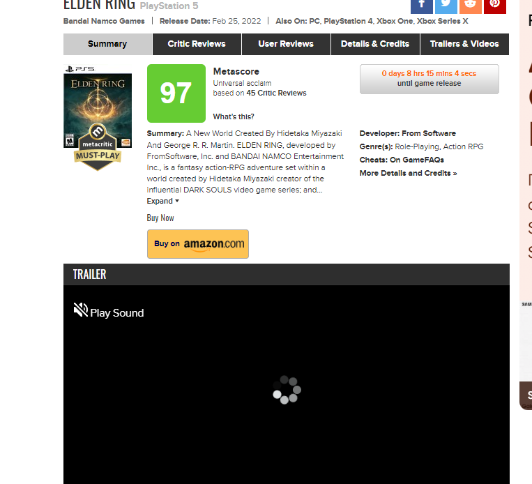 Όπως φαίνεται το Elden Ring, ήρθε για να μείνει. Μετά τη λήξη του εμπάργκο, έχουν ανέβει αρκετά reviews τα οποία κάνουν το Elden Ring να φαντάζει έπος. Όπως και να έχει οι βαθμολογίες στο PS5 να φτάνουν το 97 ενώ σε PC το 95. Ζούμε εποχές Dark Souls και Sekiro. Αύριο είναι το release με αμέτρητους παίκτες να περιμένουν πως και πως για τη κυκλοφορία του!