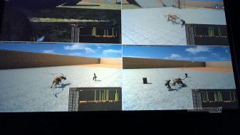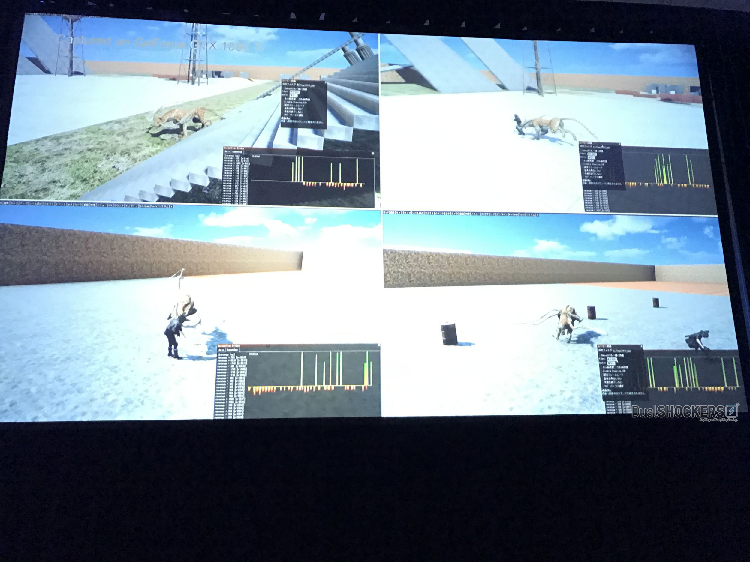 Αυτή την στιγμή η ομάδα ανάπτυξης εργάζεται πάνω σε τρεις τομείς. Στην μέθοδο Procedural generation, στην A.I και στις καταστροφές του περιβάλλοντος με τους Developers να συνεργάζονται στενά με την ομάδα της Nvidia. O Hajime Tabata μίλησε με λεπτομέρεια για ένα από τα στοιχεία που επεξεργάζεται η ομάδα του. Στις φωτογραφίες βλέπετε μία μάχη με ένα τέρας και δείχνει για το πως ο αλγόριθμος μάχης του τέρατος προσπαθεί να καταπολεμήσει τον παίχτη αλλά και να μάθει από αυτούς επιτάσσοντας έτσι την δράση του τέρατος με βάση για το τι συμπεριφορά θα έχει ο παίχτης.