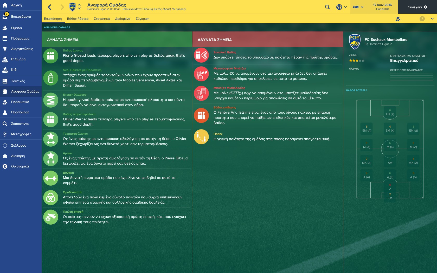 Ανάλογα με το roster που έχετε θα προσπαθήσετε να προσαρμόσετε και την κατάλληλη τακτική όπου μετά από αρκετά παιχνίδια θα δείτε και το κατά πόσο οι παίχτες σας αφομοιώνουν την τακτική που επιλέξατε. Αφήνοντας το κομμάτι της τακτικής όπως ανέφερα και πιο πάνω το προσωπικό της ομάδας θα σας δώσει πολλές λεπτομέρειες σχετικά με τους παίχτες αλλά και σαν σύνολο ομάδας. Να υπενθυμίσω πως τα report των Scouters είναι ιδιαιτέρα αναλυτικά και σας βοηθάνε στο τι θα επιλέξετε ώστε να στελεχώσετε κατάλληλα την ομάδα σας. Στις καρτέλες των παιχτών θα βρείτε πάρα μα πάρα πολλές λεπτομέρειες κάνοντας έτσι τον τίτλο ακόμη πιο ρεαλιστικό. Ακόμη έχουν προστεθεί και επιπλέον επιλογές ρόλων για το προσωπικό της ομάδας. Μιλώντας για ρεαλισμό καλή δουλειά έχει γίνει και στο τομέα των μεταγραφών – δανεισμών καθώς έχουν προστεθεί πολλές ακόμη λεπτομέρειες κάνοντας έτσι το παιχνίδι να πλησιάζει περισσότερο στην πραγματικότητα.