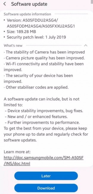 Επιπλέον, το νέο firmware φέρνει εικονίδιο συντόμευσης για QR Scanner ενώ βελτιώνει την κάμερα και το WiFi. Παρακάτω μπορείτε να δείτε το πλήρες changelog της συγκεκριμένης έκδοσης που έχει μέγεθος 190MB και αριθμό A505FDDU2ASG4. Προς το παρόν το roll out ξεκίνησε από την Ινδία οπότε ίσως θα πρέπει να κάνετε υπομονή κάποιες ημέρες μέχρι να το λάβετε.