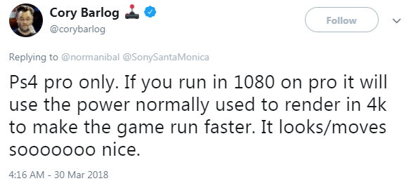 Απαντώντας σε έναν fan στο twitter, o Cory Barlog δήλωσε πως αν με Pro μοντέλο παίζετε σε 1080p οθόνη, ο τίτλος θα τρέχει “γρηγορότερα”, αναφερόμενος σε περισσότερα καρέ αλλά χωρίς να μιλάει για συγκεκριμένο αριθμό ή κάτι περί 60FPS. Ίσως να υπάρχει ξεκλείδωτο framerate, όπως έγινε και με το God of War IIΙ στο PlayStation 3.