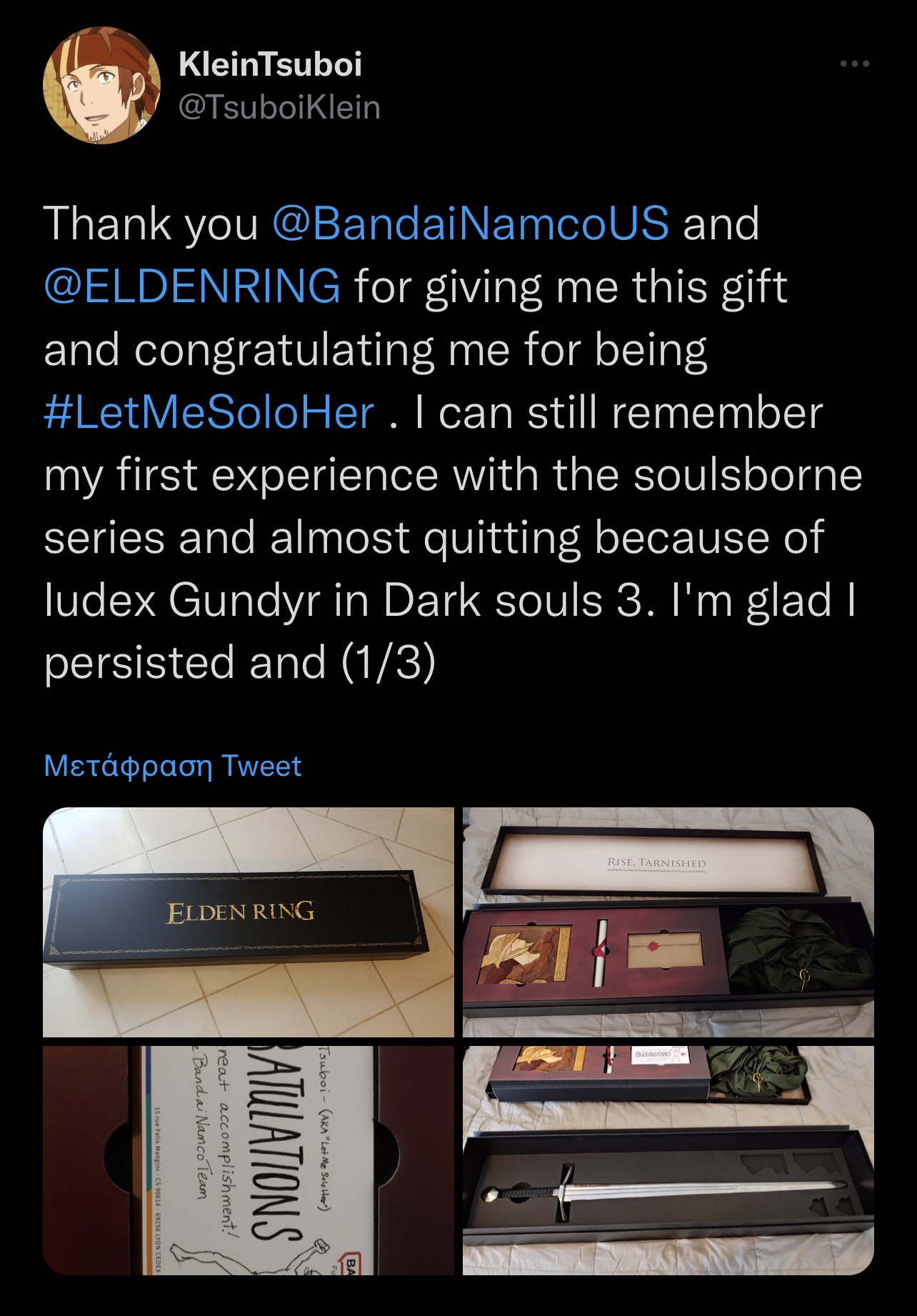 H Bandai Namco δεν έχασε την ευκαιρία να τον επιβραβεύσει για τα 1.000 kills της Malenia και του έστειλε ένα υπερ-σπάνιο μοναδικό σπαθί με στοιχεία από το Elden Ring, δείχνοντας παράλληλα και την ευγνωμοσύνη της.