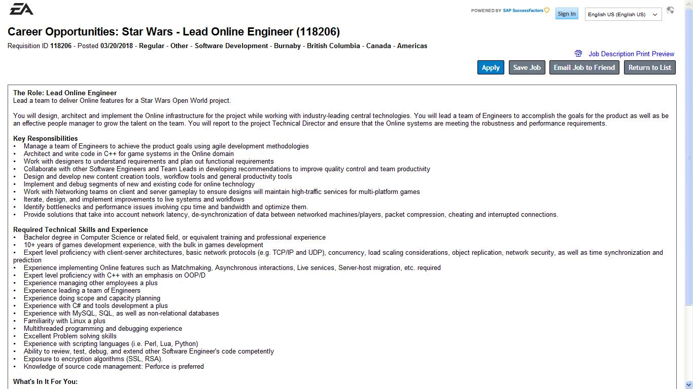 Η ΕΑ δεν το βάζει κάτω και όπως όλα δείχνουν θέλει να φέρει σε κυκλοφορία και άλλα παιχνίδια με θέμα τι άλλο φυσικά το Star Wars. Αυτό προκύπτει και από την λίστα που έχει αναρτήσει η ΕΑ Vancouver με τις διαθέσιμες θέσεις εργασίας. Συγκεκριμένα η θέση εργασίας αφορά έναν lead designer Engineer για τις online υπηρεσίες ενός μελλοντικού open world Star Wars.