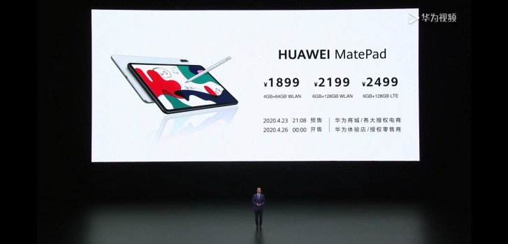 H τιμή του Huawei MatePad ξεκινάει στην Κίνα από τα 270 δολάρια (4GB + 64GB Wi-Fi) με την μεσαία έκδοση (6GB + 128GB Wi-Fi) να ανέρχεται στα 310 δολάρια και την κορυφάια (6GB + 128GB LTE) στα 350 δολάρια. Το μοναδικό χρώμα στο οποίο θα κυκλοφορήσει είναι το λευκό.