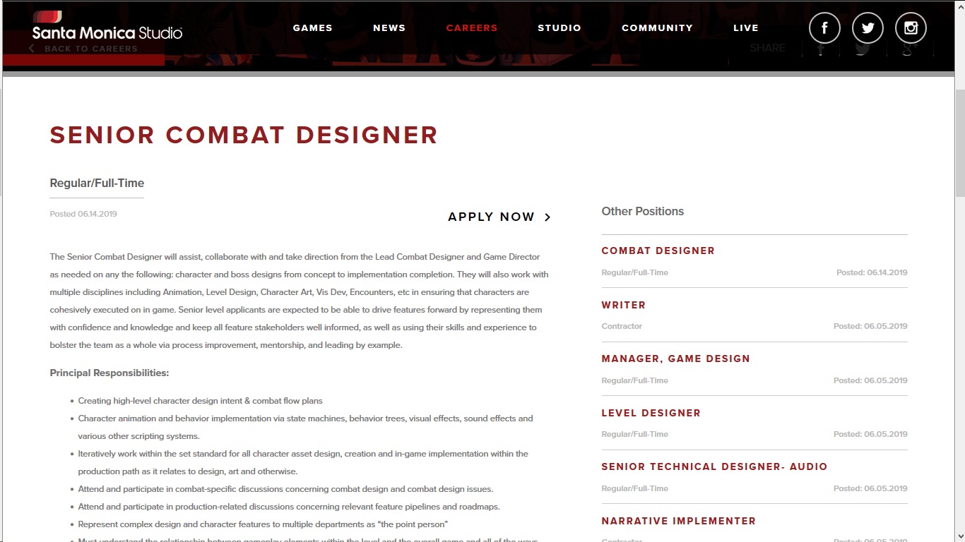 Φυσικά ακόμη περισσότερες ενδείξεις έχουμε και από τις θέσεις εργασίας όπου έχει αναρτήσει η Santa Monica μέσω της επίσημης ιστοσελίδας της Sony Santa Monica Careers Page. Σύμφωνα με την συγκεκριμένη θέση εργασίας η εταιρεία αναζητεί έναν νέο Combat Designer όπου θα βελτιώσει και θα εξελίξει προφανώς το σύστημα μάχης του παιχνιδιού