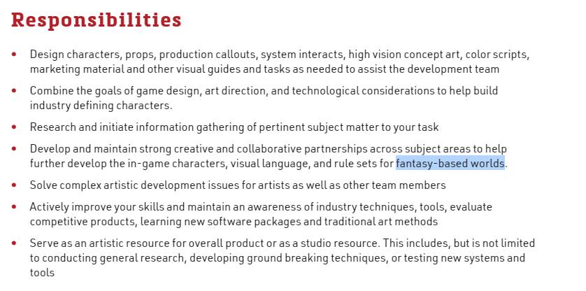 Φέτος τον Ιανουάριο είχαμε γράψει πως η Naughty Dog ίσως εργάζεται σε έναν νέο fantasy τίτλο. Βαδίζοντας με το ίδιο σκεπτικό όλοι λίγο πολλοί θα αναρωτιόμαστε για τις θέσεις εργασίας της Santa Monica Studio που έχει αναρτήσει στο Site και σύμφωνα με τις θέσεις εργασίας που αναζητά ίσως εργάζεται πάνω σε έναν νέο fantasy τίτλο. Η περιγραφή της θέσης αυτής έχει να κάνει με έναν έμπειρο Character Concept Artist με προσόντα στο να σχεδιάζει νέους κόσμους και νέους χαρακτήρες. Το πιο βασικό εδώ είναι όταν αναφέρεται στους νέους χαρακτήρες και ίσως το Studio εργάζεται πάνω σε κάτι νέο.