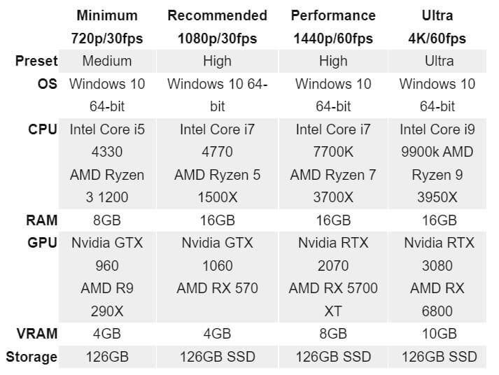 Σύμφωνα με τις απαιτήσεις αυτές λοιπόν, οι χρήστες PC θα χρειαστούν μια NVIDIA GTX960 ή μια AMD R9 290X για να το «τρέξουν» στα 720p σε ρυθμίσεις Medium με 30fps. Σε ανάλυση 1080p και 30fps, θα χρειαστεί μία NVIDIA GTX 1060 ή AMD RX 570. Για παιχνίδι σε ανάλυση1440p και 60 fps, συνιστάται η χρήση μιας NVIDIA RTX 2070 ή AMD RX 5700XT ενώ όσον αφορά ανάλυση και απόδοση 4K/Ultra/60fps, θα χρειαστούμε μια NVIDIA RTX3080 ή μια AMD RX 6800.