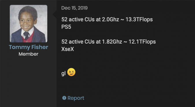 Ο leaker, όπως βλέπετε στην εικόνα, προέβλεψε στις 15 Δεκεμβρίου 2019 ότι το Xbox Series X θα φτάσει τα 12.1 TFlops με συγχρονισμό της κάρτας στα 1.82 Ghz κάτι που επιβεβαιώθηκε χθες από την ίδια την Microsoft. Η προβλεψή του για το PlayStation 5 είναι τα 13.3 TFlops με συγχρονισμό της κάρτας στα 2.0 Ghz. Αυτό το συγκεκριμένο leak έβαλε φωτιά τόσο στο forum του NeoGAF όσο και στην gaming κοινότητα που επιθυμεί διακαώς να μάθει τα τεχνικά χαρακτηριστικά του PlayStation 5.