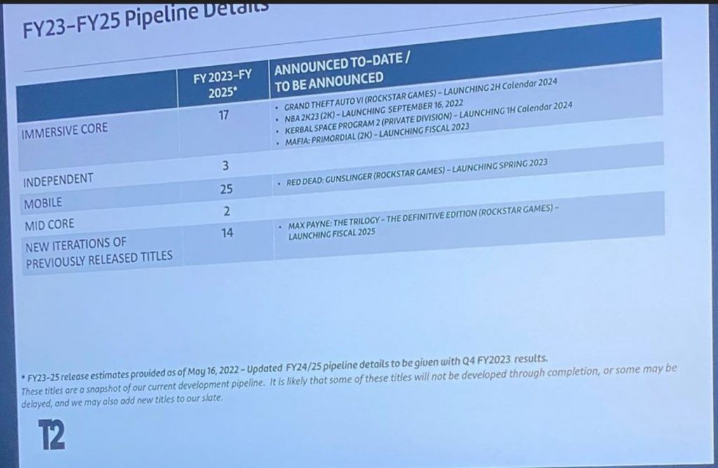 Σύμφωνα με την παραπάνω εικόνα το νέο GTA θα κυκλοφορήσει το δεύτερο μισό του 2024 με το νέο Mafia Primordial να έρχεται το 2023 ενώ το remake της τριλογίας του Max Payne να πηγαίνει για το 2025. Γενικά όπως με κάθε τέτοιου είδους leak ή φήμη θα πρέπει να είμαστε καχύποπτοι και ειδικότερα όταν μιλάμε για νέο GTA και Rockstar, πάντως αν ισχύσει θα δούμε το νέο GTA πολύ νωρίτερα από όσο πιστεύαμε.