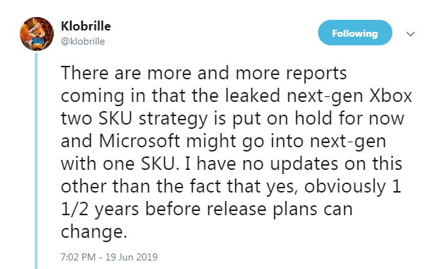 Τα νέα έρχονται από τον γνωστό Klobrille του twitter, προσθέτοντας ότι πολλά μπορούν να αλλάξουν μέσα σε ενάμιση χρόνο που αναμένεται να κυκλοφορήσει το Xbox επόμενης γενιάς. Oπότε ίσως να είναι όντως κάτι προσωρινό μέχρι να γίνει κάποια πρόοδος στο Anaconda μοντέλο, που είναι και το ισχυρότερο μοντέλο, με το οικονομικότερο μοντέλο Lockhart να γίνεται διαθέσιμο κάποιους μήνες μετά (κάτι που γίνεται και στον χώρο των H/Y).