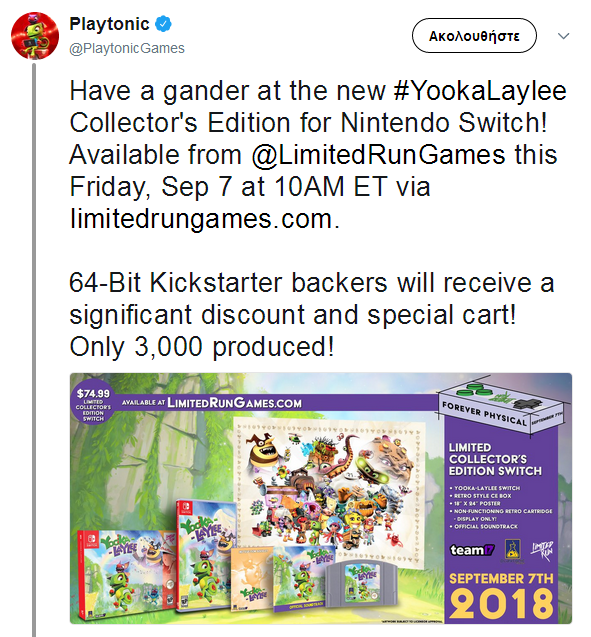 Φαίνεται πως τα στελέχη της Playtonic δεν ξέχασαν από που ξεκίνησαν και σε συνεργασία με την Limited Run Games, ετοιμάζουν μια ιδιαίτερη συλλεκτική έκδοση για το Yooka-Laylee στο Nintendo Switch.