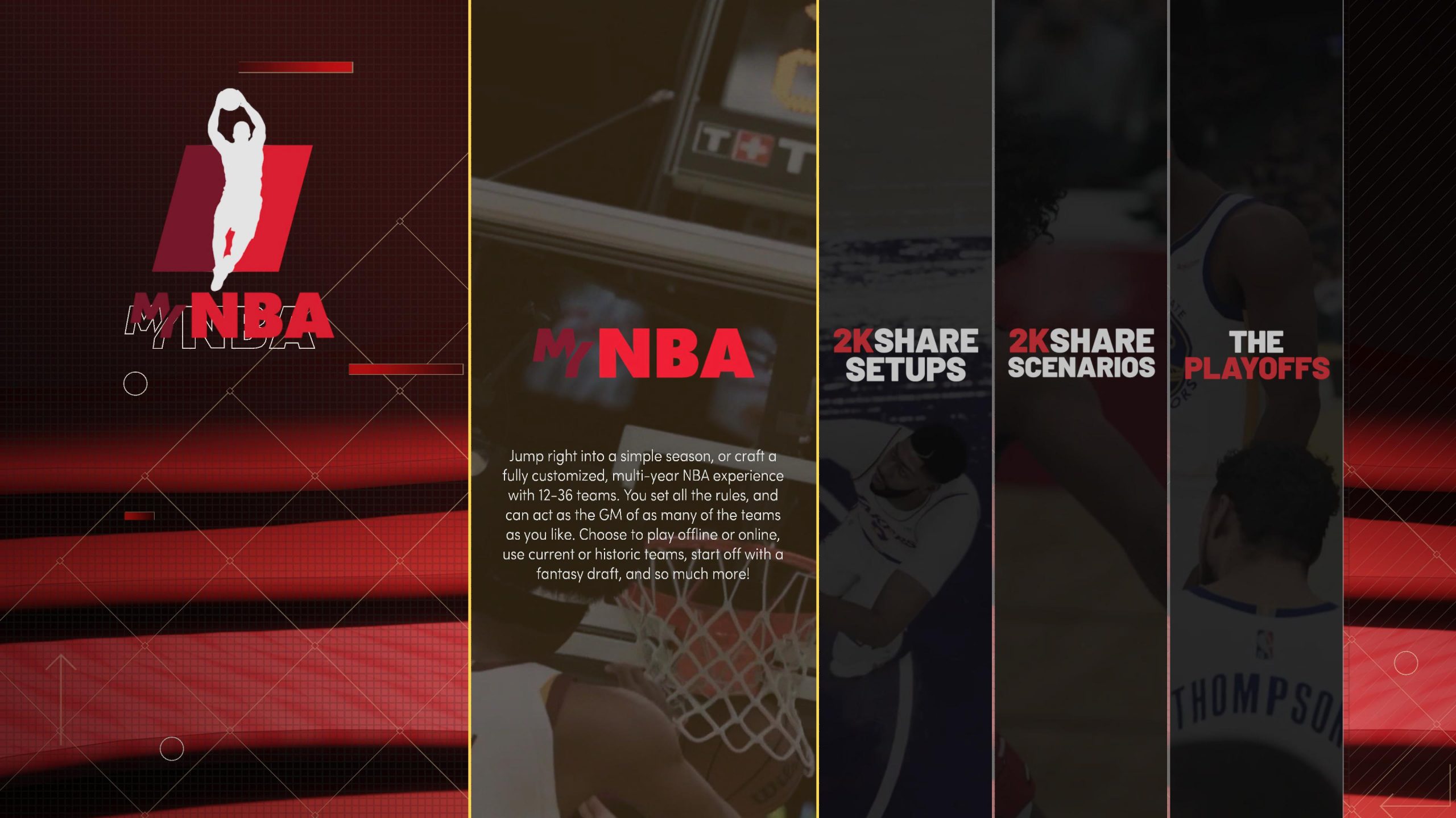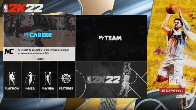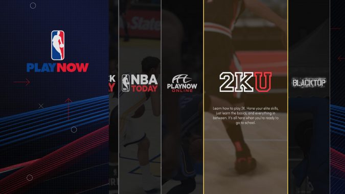 H αρχική οθόνη αρκετά γνώριμη σε σχέση με τα προηγούμενα χρόνια φέρνει μια πληθώρα επιλογών που κάποιος μπορεί να επιλέξει. Ο χρήστης θα μπορεί να επιλέξει στο Play Now όπου μπορούμε να παίξουμε ένα παιχνίδι Quick Play, το Nba Today όπου μπορούμε να παίξουμε τον αγώνα όπου ταυτόχρονα διεξάγεται εκείνη την μέρα, υπάρχει το Online Mode για online παιχνίδια, το 2ΚU όπου μπορούμε να μάθουμε τα βασικούς μηχανισμούς του τίτλου αλλά και το κλασικό Blacktop. Αυτό που θα συγκεντρώσει τα περισσότερα βλέμματα και φέτος είναι το MyCareer το MyTeam και για τους πιο ρομαντικούς το MyNba όπου μπορούν να απολαύσουν την Season του Nba αλλά με πολλές παραμετροποιήσεις αν το επιζητεί. Ακόμη υπάρχει και WNBA όπου είναι το αντίστοιχο γυναικείο NBa και επίσης εκεί μπορεί κάποιος να παίξει Season αν το επιθυμεί.