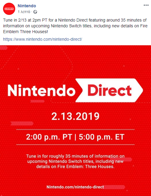 Όπως δημοσίευσε στα κοινωνικά της δίκτυα, το υλικό θα αφορά επερχόμενους Nintendo Switch τίτλους, διαρκέσει 35 λεπτά ενώ θα περιέχει πληροφορίες για το νέο Fire Emblem Three Houses. Η ώρα Ελλάδος που θα γίνει είναι 00:00 ξημερώματα Πέμπτης, 14 Φεβρουαρίου. Μπορείτε να το δείτε πατώντας εδώ.