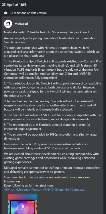 Δυστυχώς η Nintendo κρατά κλειστά τα χαρτιά της. Έτσι εταιρείες όπως η Mobapad, γνωστή για τα hardware που αφορούν τη κονσόλα Nintendo Switch, έδωσαν κάποια νεότερα για το Nintendo Switch 2.