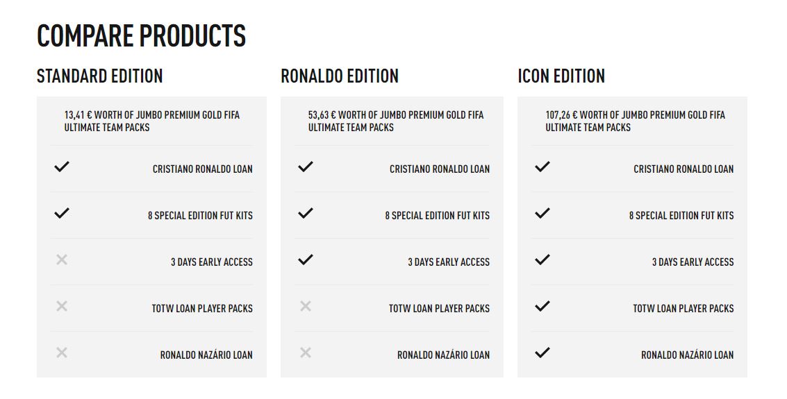 Ο Ronaldο ντριπλάρει σαν τον θεό της μπάλας και μαγεύει τα πλήθη. Το FIFA 18 θα κυκλοφορήσει σε 3 διαφορετικές εκδόσεις, την Standard Edition, την Ronaldo Edition και την Icon Edition. Οι διαφορές είναι στο υλικό που προσφέρουν και μπορείτε να δείτε τα περιεχόμενα την κάθε μίας στην εικόνα από κάτω.