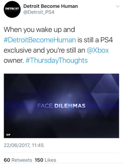 “When you wake up and #DetroitBecomeHuman is still a PS4 exclusive and you’re still an @Xbox owner. #ThursdayThoughts“