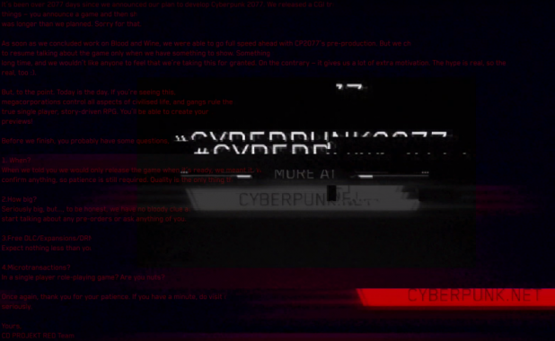 Έχουν περάσει πάνω από 2077 ημέρες από τότε που ανακοινώσαμε το σχέδιό μας να αναπτύξουμε το Cyberpunk 2077. Δείξαμε ένα CGI trailer, δώσαμε κάποιες συνεντεύξεις και … δεν ξανααναφερθήκαμε από τότε. Φυσιολογική διαδικασία γι ‘αυτά τα είδη – ανακοινώνεται ένα παιχνίδι και μετά κλείνουμε, σηκώνουμε τα μανίκια μας και πηγαίνουμε στη δουλειά. Θέλαμε να σας δώσουμε το The Witcher 3 και τα δύο DLC πρώτα, γι ‘αυτό και αυτή η περίοδος σιωπής ήταν μεγαλύτερη από ό, τι σχεδιάσαμε. Λυπόμαστε για αυτό.