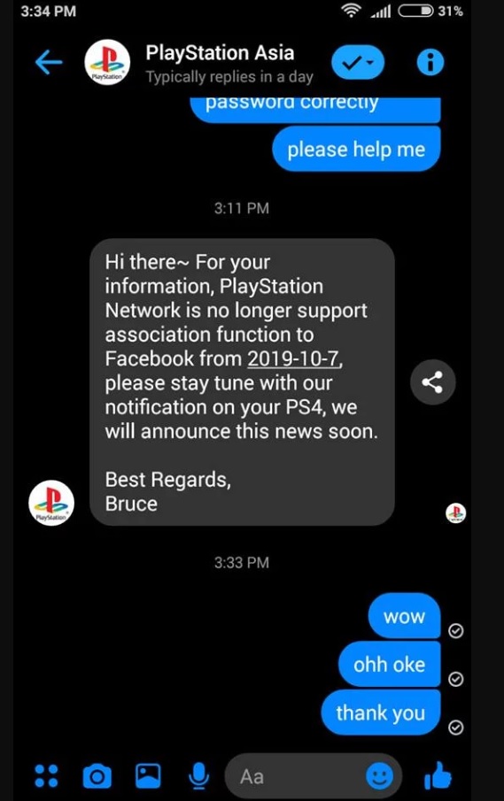 Συγκεκριμένα, ο χρήστης LegendaryKillerB στο Reddit, ανέβασε μια συνομιλία ενός φίλου με το PlayStation Asia και τη σελίδα υποστήριξης, στην οποία επισημαίνει ότι η υποστήριξη του Facebook στο PlayStation 4 θα λήξει στις 7 Οκτωβρίου του 2019 (δηλαδή αύριο)!