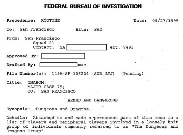 Όλοι μας γνωρίζουμε την ιστορία του Unabomber, του τρομοκράτη, ο οποίος έστελνε στα θύματά του, φακέλους, που είχαν μέσα τους βόμβες. Έχει βγει και τηλεοπτική σειρά (Manhunt: Unabomber), οπότε καλή η ευκαιρία να την τσεκάρετε. Το θέμα μας δεν είναι αυτό. Το θέμα μας είναι ότι το FBI διεξάγοντας την έρευνα που έκανε για τον μεγάλο αυτό τρομοκράτη και όχι μόνο, βρήκε συσχέτιση του D&D με τρομοκρατικές ενέργειες. Πρόσφατα, βγήκαν στη δημοσιότητα κάποια έγγραφα, τα οποία αναφέρονταν στο διάσημο αυτό παιχνίδι και στα διάφορα περιστατικά τρομοκρατίας που είχαν σημειωθεί σχετικά με αυτό. Το πρώτο έγγραφο, με ημερομηνία 1983, έχει να κάνει με «διακινήσεις κοκαΐνης στη λίμνη Γενεύη, στη περιοχή του Ουισκόνσιν». Η γενέτειρα του Dungeons and Dragons ήταν, και εξακολουθεί να είναι, μια στη λίμνη λίγο πάνω από τα σύνορα του Ιλλινόις, αφού εκεί βρίσκονται τα γραφεία της TSR, δημιουργού του παιχνιδιού. Ένας πράκτορας του FBI που βρίσκεται εκεί, παρακολουθώντας εμπόρους ναρκωτικών, υπογράφει την έκθεση, η οποία φαίνεται να είναι γνήσια.