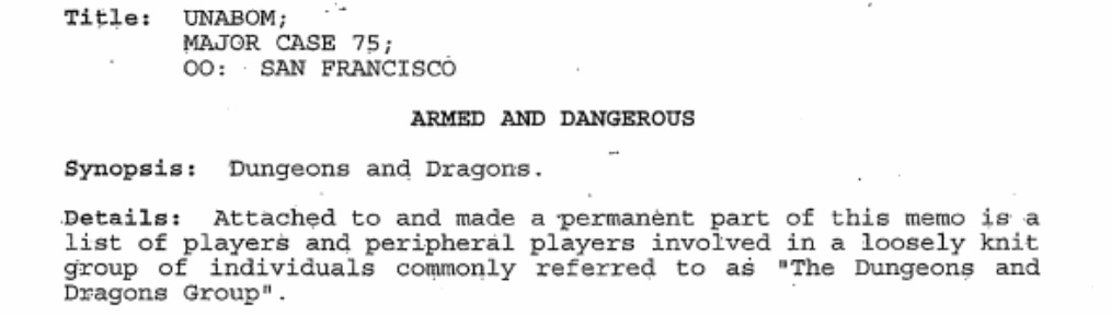 Θυμάστε που σας είπα πριν για τον Unabomber ε; Ε, το τρίτο έγγραφο αναφέρεται σε μια έρευνα που διεξήγαγε το FBI για μια ομάδα παικτών του Dungeons & Dragons, η οποία σχετίζονταν, από ότι φαίνεται, με τον διαβόητο εγκληματία που επί δύο δεκαετίες έσπερνε τον φόβο και τον τρόμο στις Ηνωμένες Πολιτείες της Αμερικής. Το πρώτο βήμα ήταν να ψάξουν το παρελθόν της TSR. Κάνοντας αυτό, το FBI συγκέντρωσε μια έρευνα τριών σελίδων. Επίσης, κατάρτισε έναν κατάλογο ένοπλων και επικίνδυνων ατόμων που ήταν «γνωστά μέλη του “Dungeons & Dragons”, τον οποίο τράβηξαν από το σύστημα ηλεκτρονικών υπολογιστών της TSR.