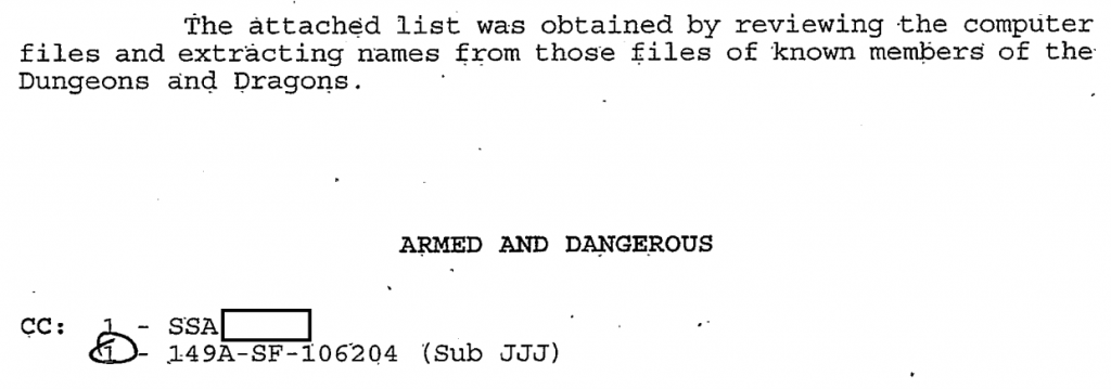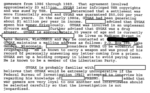 Ο συν-δημιουργός του D&D, Gary Gygax, καταγράφεται στο έγγραφο, αλλά παραμένει άγνωστο το ενδιαφέρον του FBI για τον ίδιο, αφού το κομμάτι αυτό έχει περικοπεί. Περιλαμβάνει και μια σημείωση ότι το FBI θα προέβαινε σε «επανεξέταση των εταιρικών αρχείων για την TSR, σε προσπάθεια να εντοπίσει εταιρικούς υπαλλήλους και πληρεξούσιους δικηγόρους.»