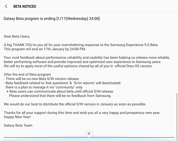 Το beta πρόγραμμα ήταν να ολοκληρωθεί σήμερα αλλά τελικά η εταιρεία θα το κρατήσει μέχρι και τις 17 Ιανουαρίου όπου και θα τερματιστεί. Αυτό, μάλιστα, έγινε γνωστό από την ίδια τη Samsung μέσω μηνύματος στα μέλη της κοινότητας της. Μετά είναι θέμα χρόνου να ξεκινήσει το roll στις συγκεκριμένες συσκευές οπότε το λογικότερο είναι να δούμε τις πρώτες συσκευές να αναβαθμίζονται σε Android 8.0 Oreo μέχρι τα τέλη του μήνα. Μάλιστα, το πιθανότερο είναι να λάβουν πρώτοι την αναβάθμιση όσοι ήταν μέρος της beta έκδοσης.