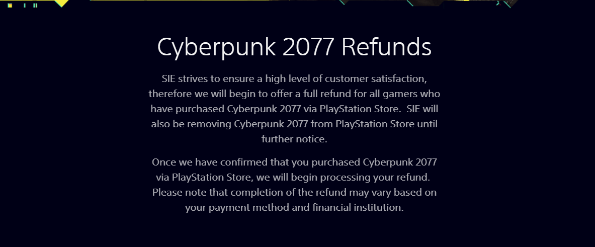 Μετά τα προβλήματα του Cyberpunk 2077 κυρίως στις βασικές κονσόλες η Sony αποφάσισε να λάβει πιο δραστικά μέτρα και απέσυρε μέχρι νεοτέρας το Cyberpunk 2077 από το PlayStation Store καθώς επίσης οργανώνει και την επιστροφή χρημάτων «refund» σε όσους το επιθυμούν δημιουργώντας μια ξεχωριστή σελίδα.