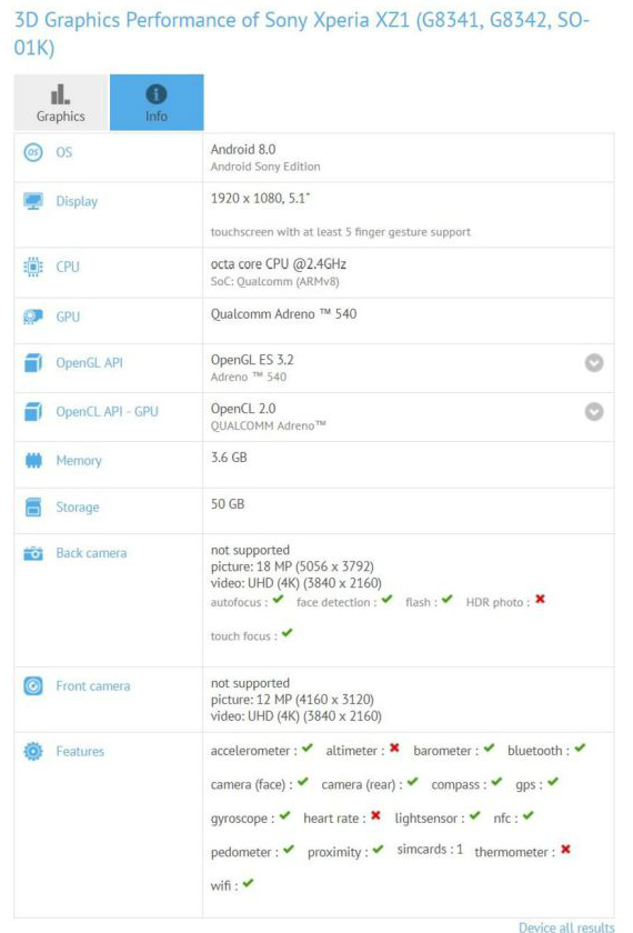 Σύμφωνα με το συγκεκριμένο benchmark, το Xperia XZ1 θα διαθέτει οθόνη 5.1 ιντσών, 1080p ανάλυσης και τον επεξεργαστή Snapdragon 835 στο εσωτερικό του. Η μνήμη RAM θα είναι στα 4GB και ο εσωτερικός αποθηκευτικός του χώρος στα 64GB. Η κύρια κάμερα του θα είναι στα 19ΜP και η εμπρόσθια στα 13MP. Εντυπωσιακό είναι το γεγονός ότι στο συγκεκριμένο benchmark εμφανίζεται με Android 8.0 με την περιγραφή να γράφει “Android Sony Edition”.