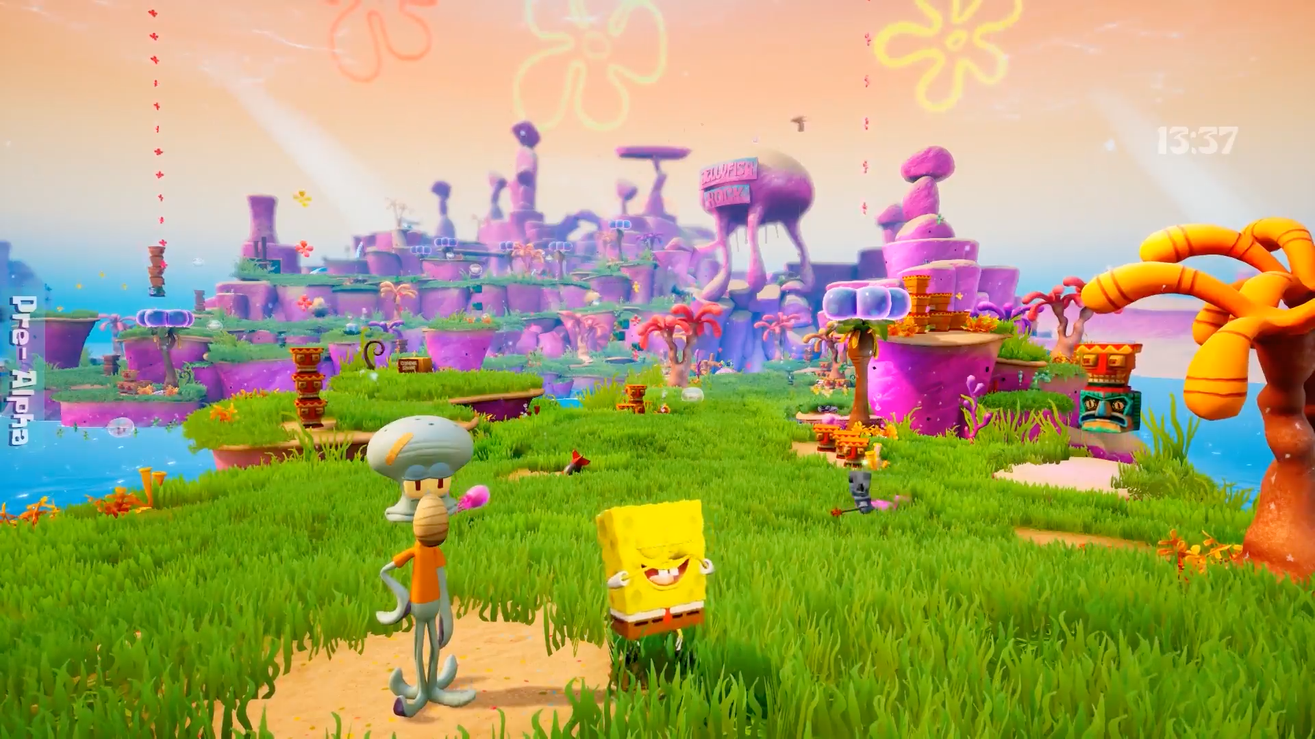 Το gameplay του τίτλου, βασίζεται πάνω σε 3 χαρακτήρες και η εναλλαγή τους, γίνεται μόνο σε κάποια bus stop, όπου έρχεται το υποβρύχιο λεωφορείο και σας αφήνει τον εκάστοτε χαρακτήρα που αναλογεί στην πίστα. Δυστυχώς το παιχνίδι δεν μας αφήνει την ελευθερία ώστε να επιλέξουμε κάθε φορά ποιον χαρακτήρα θα πάρουμε, τουλάχιστον στο βαθμό που θα ήθελα. Ο κάθε ένας από τους χαρακτήρες μας έχει την δική του ειδική κίνηση όπου και θα χρειαστείτε κατά την περιπέτειά σας. Ο Μπομπ έχει το χτύπημα με σαπουνόφουσκες, ο Πάτρικ μπορεί να σηκώνει βαριά αντικείμενα όπως καρπούζια και να τα εξαπολύει στους εχθρούς, ενώ η Σάντυ με το λάσο της, μπορεί να κρατιέται στον αέρα για μερικά δευτερόλεπτα. Αυτές είναι όλες και όλες οι κινήσεις του παιχνιδιού, οι οποίες δεν αναβαθμίζονται κατά τη διάρκειά του. Σκοπός σας σε κάθε επίπεδο, να βρείτε όσο το δυνατόν, περισσότερες χρυσές σπάτουλες μπορείτε, με τις οποίες θα καταφέρετε να ξεκλειδώσετε τη συνέχεια του παιχνιδιού. Εφόσον όμως το παιχνίδι (απ’ ότι κατάλαβα) απευθύνεται σε παιδιά, τα challenges είναι πολύ εύκολα και συχνά (ναι πολύ συχνά) επαναλαμβανόμενα, κάτι το οποίο με έκανε να βαρεθώ αρκετά γρήγορα. Να προσθέσω ακόμα ότι προχωρώντας, γύρω από πολλά επίπεδα του τίτλου, θα βρείτε νερό. Νερό μέσα σε νερό; Κουλό αλλά το έχουμε συνηθίσει και από τη σειρά (η φωτιά του κάμπινγκ yeah!). Δυστυχώς ο ήρωας μας από σφουγγάρι δεν έχει την πολυτέλεια να κολυμπήσει, οπότε το reset στο πιο κοντινό checkpoint είναι δεδομένο. Το ωραίο της υπόθεσης, είναι πως η επιστροφή στο πιο πρόσφατο σημείο σας, γίνεται με την βοήθεια του χεριού, όπως στην τηλεοπτική σειρά.