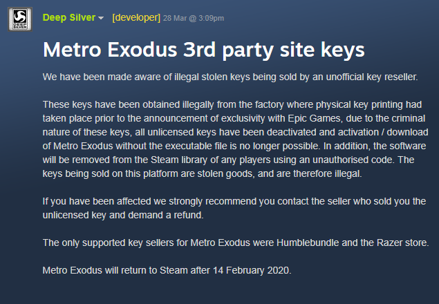 Αυτό όμως δεν είναι όλο, καθώς η Deep Silver προχώρησε σε δήλωση (μέσω Steam) ότι θα ακυρώσει όλα αυτά τα κλειδιά και το παιχνίδι θα αφαιρεθεί από τον Steam λογαριασμό όσων αγόρασαν κλειδί, καθώς όπως σημείωσε πρόκειται για κλεμμένο προϊόν και έχει κάθε δικαίωμα να προχωρήσει σε μια τέτοια ενέργεια. Τέλος, προτείνει τους χρήστες να ζητήσουν τα χρήματά τους πίσω και ότι το Metro Exodus θα κυκλοφορήσει και στο Steam μετά της 14 Φεβρουαρίου.