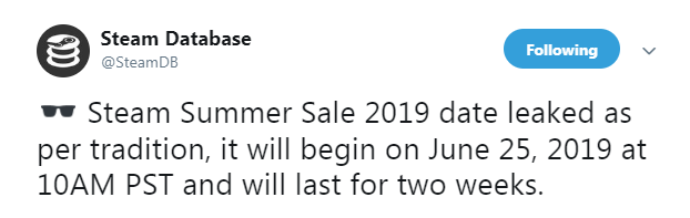 Έμπιστη πηγή για διαρροές παραμένει η ιστοσελίδα SteamDB η οποία χρόνια τώρα μας ενημερώνει για τέτοιες περιστάσεις. Συγκεκριμένα, το Steam Summer Sale 2019 θα ξεκινήσει 25 Ιουνίου και θα κρατήσει έως 9 Ιουλίου, δύο εβδομάδες. Οπότε έχετε περιθώριο να ανανεώσετε την wishlist σας και να κάνετε οικονομίες. Ευελπιστούμε πως φέτος θα γίνει πιο ανταγωνιστικό, καθώς και το Epic Games Store θα έχει τις δικές του προσφορές.