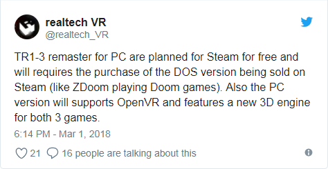 Την κυκλοφορία της κλασσικής Tomb Raider τριλογίας σε Remastered έκδοση ανακοίνωσε η realtech VR μέσω του twitter λογαριασμού της.
