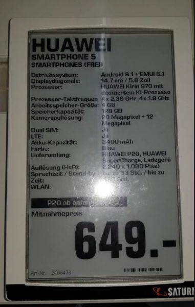 Ξεκινώντας από το κλασικό μοντέλο της εταιρείας, το ταμπελάκι του Saturn γράφει ότι θα έρθει με τον οκταπύρηνο επεξεργαστή της εταιρείας HiSilicon Kirin 970 με όλες τις δυνατότητες ΑΙ που έχουμε δει και στο Mate 10 Pro. Θα συνοδεύεται από 4GB RAM και ο εσωτερικός αποθηκευτικός του χώρος θα είναι στα 128GB, πιθανότατα επεκτάσιμος. Η οθόνη του έχει ανάλυση 2240 x 1080p δηλαδή είναι FHD+ και θα έπρεπε να θεωρούμε δεδομένο το notch στο επάνω μέρος. Οι ίντσες αυτής στις 5.8. Πίσω θα υπάρχει διπλή κάμερα με φακούς 20MP+12MP, θα είναι dualSIM και η μπαταρία του θα έχει φορτίο 3400mAh με δυνατότητα γρήγορης φόρτισης SuperCharge. Θα κυκλοφορήσει με Android 8.1 και με τον launcher της Huawei, το EMUI να βρίσκεται επίσης στην έκδοση 8.1. Η τιμή αυτού, 649 ευρώ.