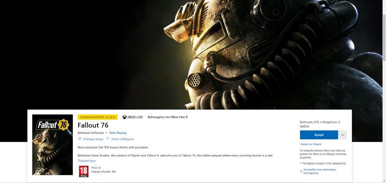 Το Fallout 76 που κυκλοφόρησε πριν από μία εβδομάδα και κάτι λιγότερο κάνοντας ένα πολύ κακό ξεκίνημα όσον αφορά τις κριτικές που έχει λάβει, μπήκε ήδη σε έκπτωση, μειωμένο κατά 33%, στο Microsoft Store. Συγκεκριμένα για τις επόμενες πέντε ημέρες θα το βρείτε από €69,99 στα €46,89.