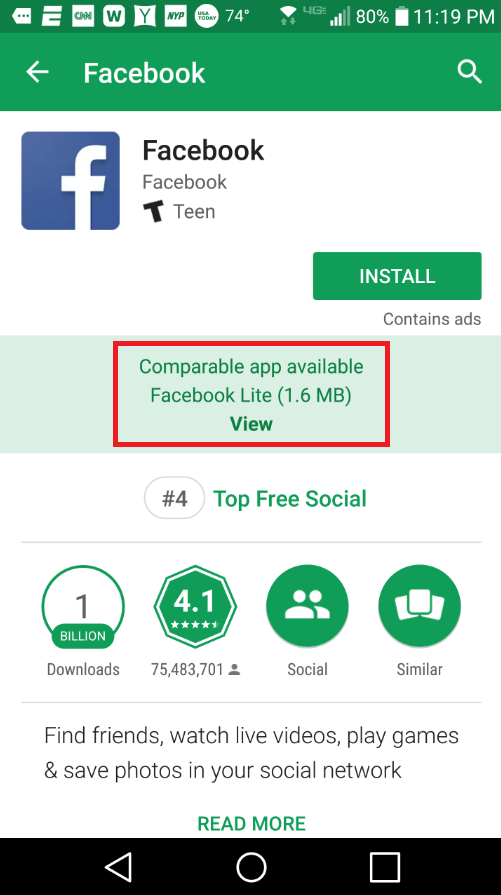 Δεν έχουν όλοι ακριβό smartphone με εντυπωσιακά specs και αυτό είναι κάτι που οδήγησε την Google στο να προβεί σε αυτήν την ενέργεια ειδικά από τη στιγμή που οι γνωστές εφαρμογές γίνονται ολοένα και πιο μεγάλες και φυσικά πιο ενεργοβόρες. Για παράδειγμα, αν σκέφτεστε να εγκαταστήσετε το Facebook, θα δείτε μία μικρή υπενθύμιση ότι το Facebook Lite είναι μία επιλογή για το τηλέφωνο σας. Η Lite έκδοση του δημοφιλούς social app, είναι μόλις 1.6MΒ ενώ η πλήρης έκδοση είναι 60MΒ. Πατώντας στην ένδειξη “view” κάτω από την υπενθύμιση σας πάει απευθείας στην εφαρμογή Facebook Lite. Αντίστοιχες Lite εφαρμογές είναι και τα Skype Lite και Twitter Lite.