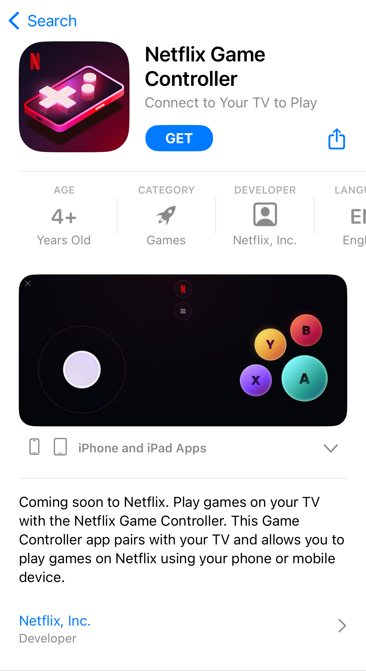 Στα πλαίσια της προσπάθειας αυτής, δημιούργησε μια νέα εφαρμογή ονόματι “Netflix Game Controller” η οποία είναι διαθέσιμη στο App Store της Apple. Σκοπός της εφαρμογής αυτής είναι να επιτρέψει στον χρήστη να χρησιμοποιήσει το smartphone του για να παίξει τα παιχνίδια της υπηρεσίας στην τηλεόρασή του.