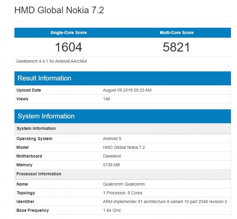 Σύμφωνα, λοιπόν, με το GeekBench, το Nokia 7.2 θα διαθέτει επεξεργαστή της Qualcomm (μάλλον τον Snapdragon 660) χρονισμένο στα 1,84GHz. Το συγκεκριμένο SoC θα συνοδεύεται από 6GB RAM και θα “τρέχει” Android 9 Pie. Όσον αφορά στο σκορ που έπιασε στο benchmark, στο Single-core σκορ έφτασε τους 1604 πόντους και στο Multi-core τους 5821.