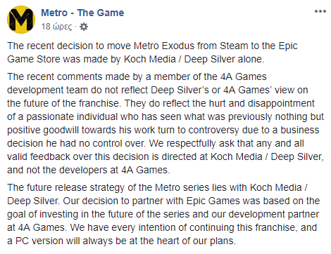 Κάπου εκεί λοιπόν, εμφανίστηκε δήλωση (η πηγή είναι στα Ρωσικά) από έναν εργαζόμενο της 4A Games υπό το ψευδόνυμο scynet, ο οποίος είπε ότι “Αν το νέο Metro Exodus δεν πουλήσει καλά στο PC λόγω του boycott για την αργοπορημένη αλλαγή ψηφιακού καταστήματος, τότε το επόμενο Metro, αν υπάρξει, δεν θα κυκλοφορήσει για PC.“.