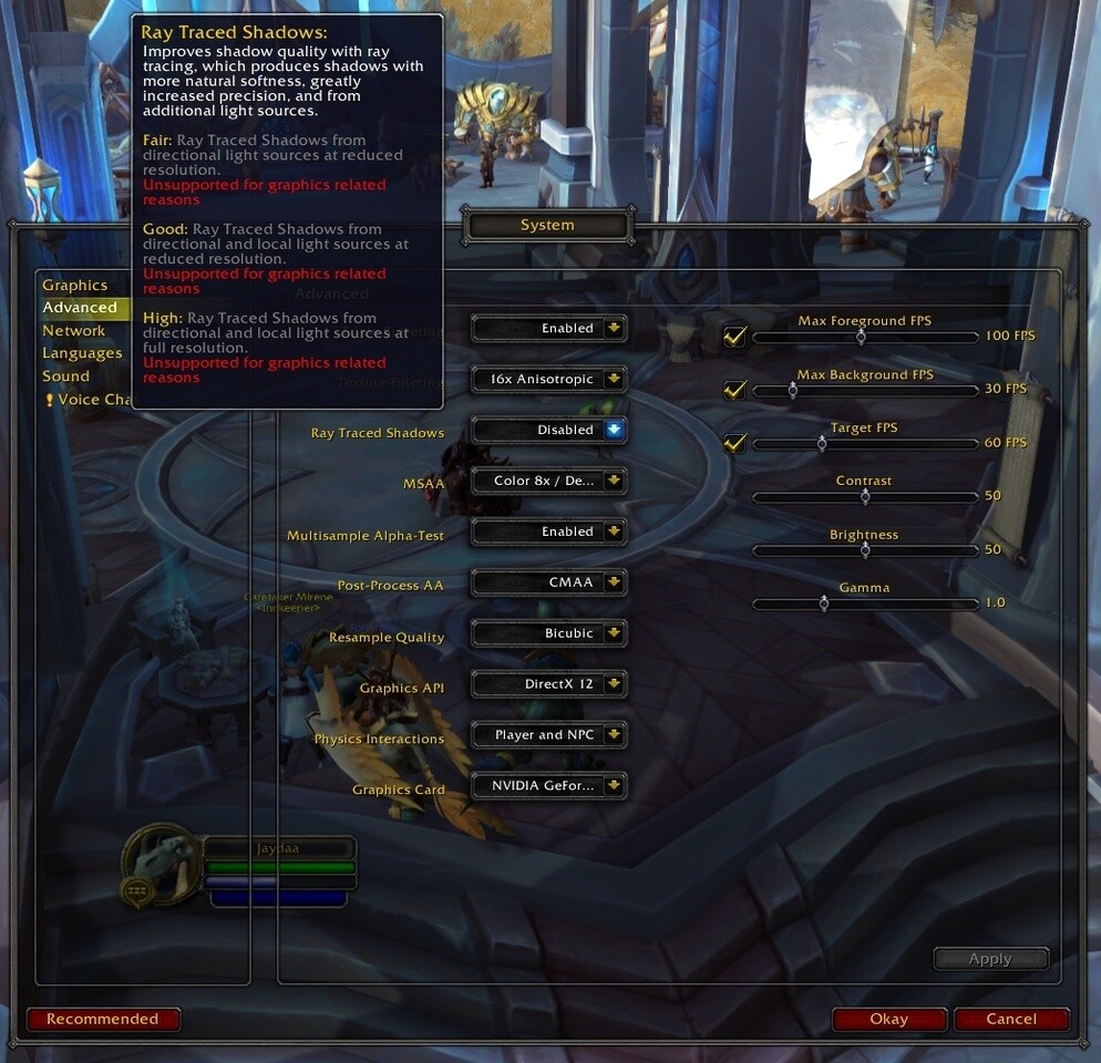 Μετά το Call of Duty: Modern Warfare και το Minecraft, το επικό World of Warcraft, ετοιμάζετε να μπει στην οικογένεια του ray-tracing. Αυτή τη στιγμή έχουμε κοντά μας την Alpha Beta για το επερχόμενο Shadowlands και το update το οποίο κυκλοφόρησε πριν λίγες μέρες έχει ένα graphic option που αφορά το ray-tracing με επιλογές fair/good/high στις σκιές! Παρότι δεν μπορούμε ακόμα να το ενεργοποιήσουμε, σίγουρα τους επόμενους μήνες θα είναι δυνατό. Να υπενθυμίσουμε ότι η Blizzard ετοιμάζει πολλές αλλαγές στα μοντέλα των χαρακτήρων και όχι μόνο.