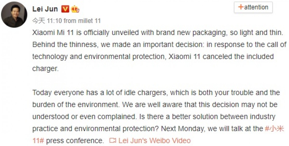 Φαίνεται ότι η εταιρεία ακολουθεί τα χνάρια της Apple αφού ο CEO, Lei Jun, επιβεβαίωσε ότι το Mi 11 -που θα ανακοινωθεί αύριο- δεν θα έχει φορτιστή στο κουτί! Ο Jun, φυσικά, επικαλέστηκε περιβαλλοντικούς λόγους για την κίνηση του Κινέζικου κολοσσού ενώ αναφέρει ότι γνωρίζει πως αυτή η απόφαση μπορεί να μην γίνει δεκτή χωρίς αντίκτυπο από τους καταναλωτές.