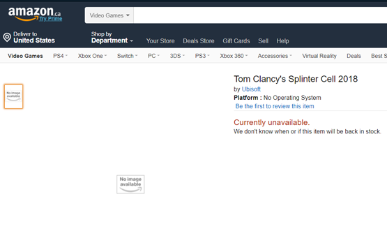 Διαρροών συνέχεια για το νέο Splinter Cell που όπως όλα δείχνουν θα κάνει την εμφάνιση του στην Ε3 2018. Αυτήν την φορά το Amazon στον Καναδά εμφάνισε το Tom Clancy’s Splinter Cell 2018 για προ-παραγγελία και έβαλε φωτιά στις φήμες για τον νέο αυτό τίτλο.